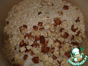 Подмешиваем сахар, овсяные хлопья и рубленый фундук.