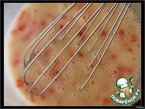 Помидор обдать кипятком, снять кожицу, нарезать кубиками и соединить с яичной массой.