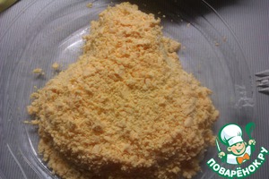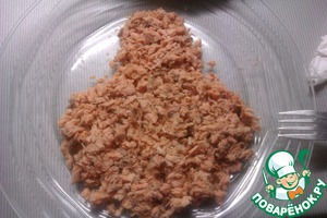 Горбушу отжать, измельчить вилкой и выложить на блюдо для салата в виде пингвина.