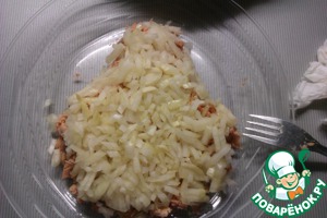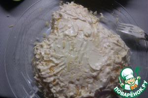 Сверху посыпать измельченным репчатым луком и смазать майонезом - это будет первый слой салата.