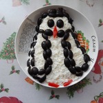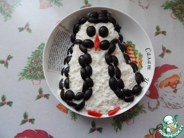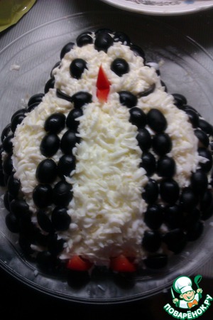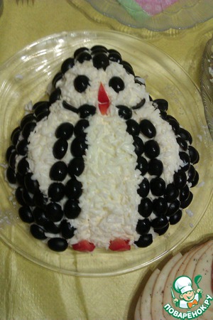 Украсить маслинами и сладким красным перцем в виде пингвина. -