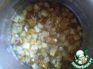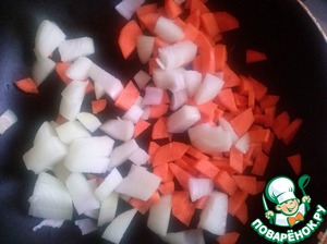 Крупными кубиками нарезаем лук и морковь, жарим на предварительно разогретой сковороде со сливочным маслом, ужарив до золотистой корочки, добавляем 3 ст. ложки томатной пасты и немного бульона. Тушим 10 минут.