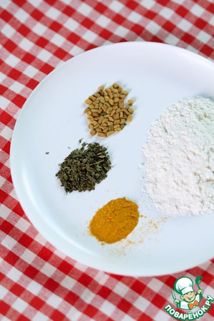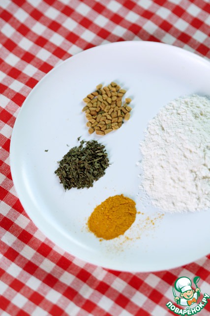 Перед приготовлением супа подготовим наши специи: куркуму, шамбалу, мяту и отмерим муку. |