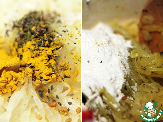 Снимем крышку, увеличим огонь, добавим наши специи, оставшееся оливковое масло, перемешаем и добавим муку. Снова перемешаем и будем готовить 3-4 минуты, помешивая. |