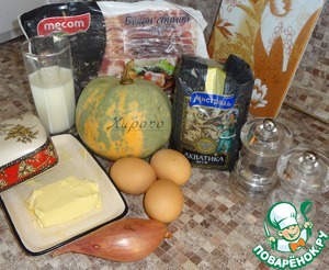 Разогреть в сковороде 2ст. л. растительного масла и немного обжарить бекон. Добавить к нему нарезанный лук и поджарить до аппетитного румяного цвета. Отложить лук с беконом в глубокое блюдо. В эту же сковороду положите сливочное масло ( кто заботится о свое фигуре, может поменьше положить и обязательно оставьте 1 - 2ст. л. для смазывания формы). Когда масло растает, положите тыкву и жарьте её, как картошку, до румяного состояния. -