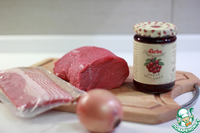 Для приготовления этого блюда понадобится хорошая говяжья вырезка. Я купила глазную мышцу. А также нам понадобится лук, бекон и брусничный соус d'arbo. На фото не хватает сливок.