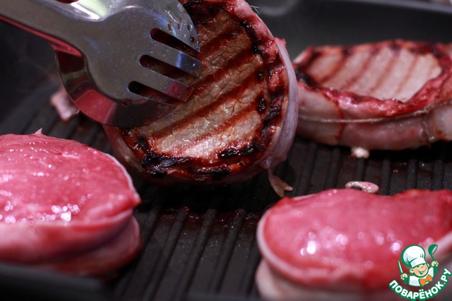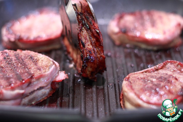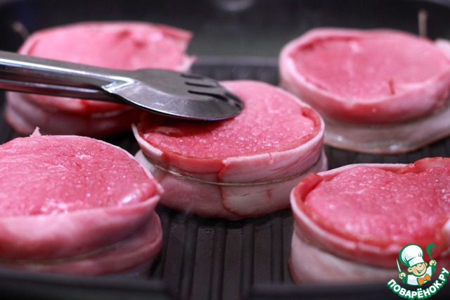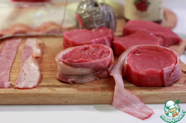 Каждый стейк оберните полоской бекона. У меня бекон был широкий, но короткий, поэтому я каждую ленту разрезала вдоль на 2 части и обернула внахлест дважды.