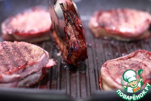Разогрейте сковороду-гриль*, каждый миньон смажьте оливковым маслом и припечатайте стейк к сковороде. Огонь немного уменьшите и жарьте миньоны по 5 минут с каждой стороны. Некоторое время нужно будет прижимать мясо лопаткой, чтобы оно прихватилось.