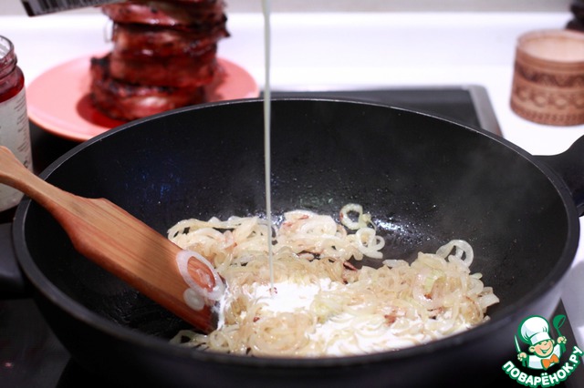 Растопите на сковороде 20 г сливочного масла и обжарьте лук до появления приятной золотистости, уменьшите огонь и влейте сливки. -