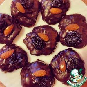 Я этого не сделала, поэтому печенье снялось не очень красиво. Но я не сдалась: покрыла печенье шоколадной глазурью и украсила черносливом и миндалем. Получилось лучше, чем было.