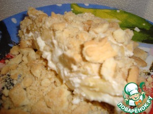 И в чем смысл посыпания сверху, ведь все печенье в результате высыпалось. Гораздо логичнее насыпать печенье в форму, залить кремом и поставить охлаждаться. В результате печенье схватится с начинкой и будет единое целое. А так, суфле отдельно, печенье отдельно, на торт не тянет, уж извиние.