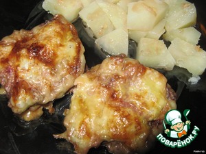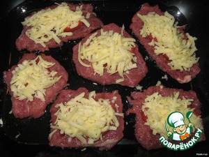 На смазанный маслом противень положить мясо, на него чеснок (немножко),