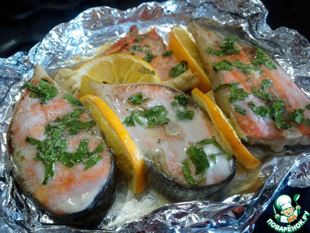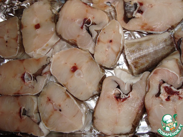 Начинаем собирать наше блюдо. Противень застилаем фольгой, перекладываем туда рыбу, солим и перчим.