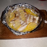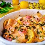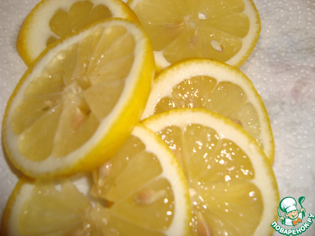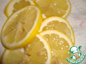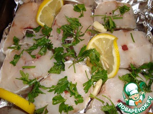 Между кусочками рыбы укладываем лимон, раздавленный чеснок и посыпаем сверху мелко нарезанной петрушкой.