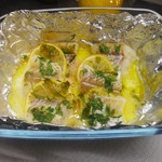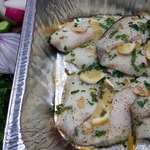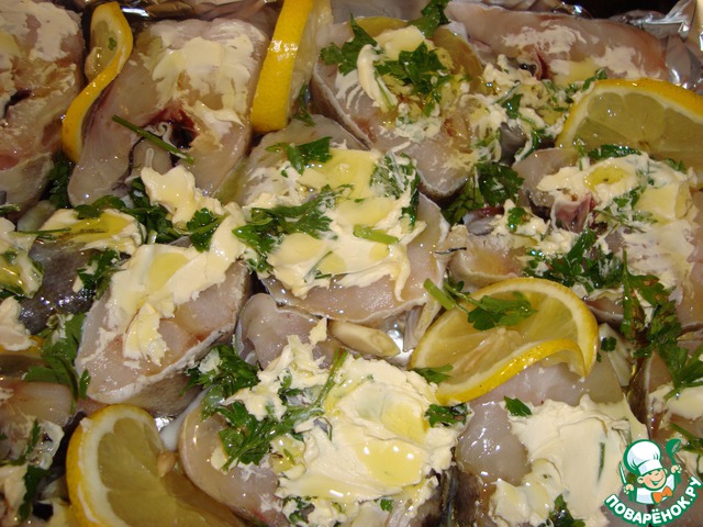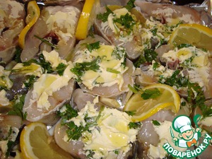 Смазываем каждый кусочек рыбы сливочным маслом (или же просто кладем по маленькому кусочку масла на рыбу) и сбрызнуть все оливковым маслом.