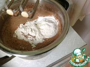 • Добавляем растопленное масло, муку и разрыхлитель - перемешиваем
