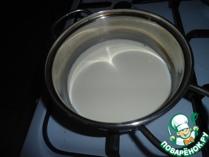 Тем временем на плите подогреть молоко, сливки и сахар. Дать покипеть 5 минут.