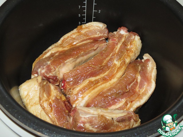 • Лук нарезать полукольцами. Ребрышки поместить в чашу и залить маринадом, накрыть луком, оставить на 2-3 часа для маринования.