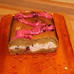 [+4]У меня форма - побольше, поэтому прослойка не везде толстенькая получилась, здесь кусочек, для фото с маленьким слоем прослойки. Остальное - на вынос было, там потолще места с сыром попадались