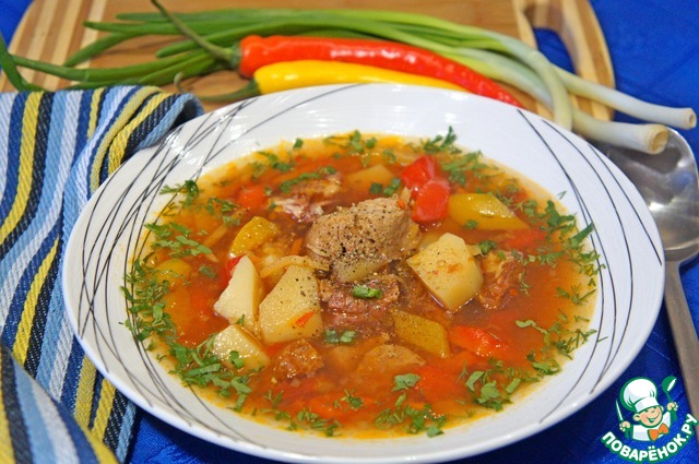 "Бограч", венгерский суп. Рецепт этого вкуснейшего супа мне привез супруг из Западной Украины, теперь просит готовить дома)) Можно готовить из разного мяса (говядина, телятина, баранина), у меня телятина. Также его готовят в казане и на костре. Всем рекомендую!)
