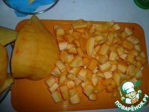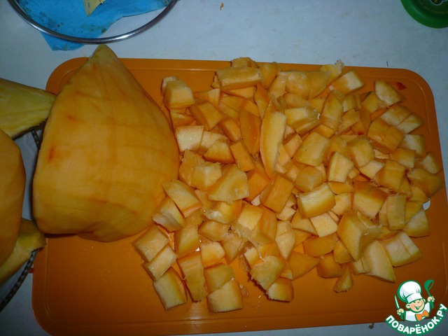 - Тыква (тыквы все по размеру разные, поэтому скажу так, у вас должно получиться половина 3-х литровой кастрюли, когда вы её нарежете на мелкие кусочки) — 1 шт