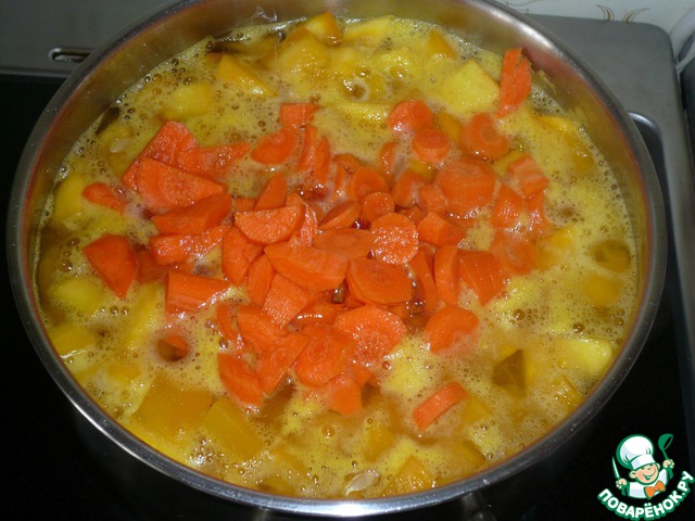 Тыкву и морковку кладем в кастрюлю и заливаем водой так, чтоб еще осталось место для молока и сырков. На фото я перелила водички, потом пришлось отливать пару кружек. Как говорится, все познается со временем, в следующий раз буду меньше наливать воды. Варим наши овощи, пока они не станут мягкими, чтобы потом их было легко пюрировать блендером.