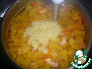 Вот и сварились наши овощи. Снимаем с плиты кастрюлю, добавляем в нее чеснок.