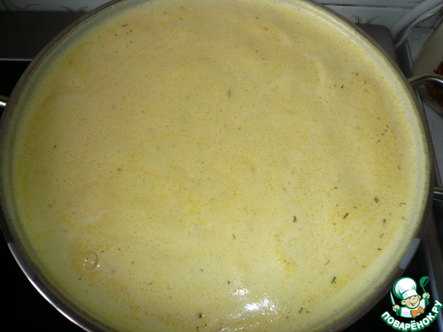И всё это выливаем в нашу кастрюлю с пюрешкой. И добавляем ложку куркумы. Если её нет, то не страшно, можно и без неё, на этот раз у меня её как раз и не оказалось. Просто от неё супчик желтее получается.
