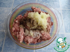 А пока подготовим фарш, добавив к нему натертый лук, соль, перец.