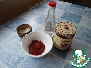 Тем временем займемся приготовлением соуса. Томатную пасту соединяем с брусничным соусом, подсаливаем по вкусу, добавляем немного водички (кипяченой).