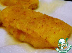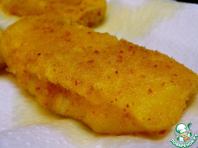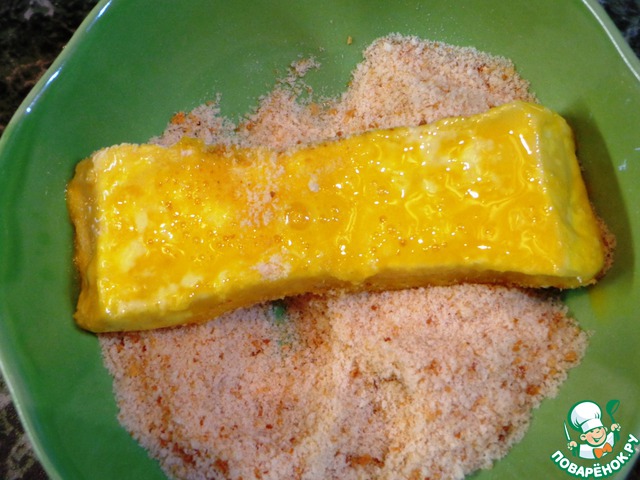 Каждый кусочек сыра панируем: яйцо, затем мука, опять яйцо и сухари
