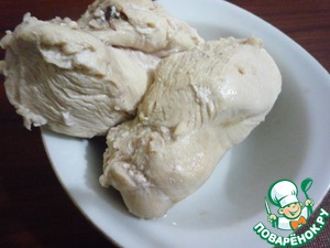 Курицу отварить в воде. Немного остудить и мелко нарезать. Добавить соли и черного перца.