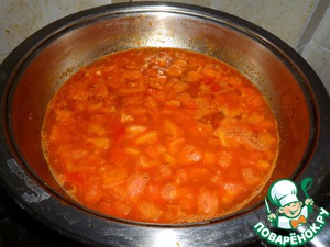 Мелко нарезать помидор, болгарский перец и петрушку. Слегка обжарить на сливочном масле перец, добавить помидор, немного томатной пасты (можно и без). Добавить 1 стакан куриного бульона, посолить, поперчить красным перцем. Тушить минут 10-13. Добавить мелко нарезанную петрушку. Еще тушить 5 минут.