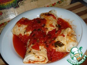 В глубокую тарелку выкладываем рулеты и заливаем томатным соусом. К такому блюду на гарнир подойдет рис.