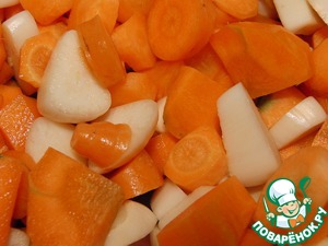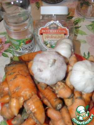 Морковку и чеснок тщательно промыть, очистить от кожуры. Нарезать на равные кубики и плотно уложить в банки...