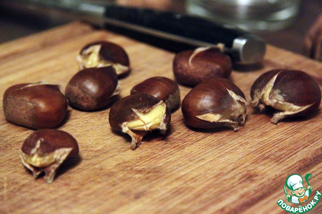 Каштан надрезать крест-накрест и отправить на 10 минут в разогретую до 200 градусов духовку, когда каштан раскроется (как на фото), - он готов.
