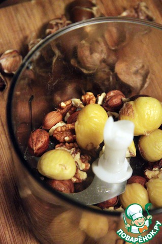 Соединить каштан и орехи в блендере и смолоть до образования не крупной крошки.