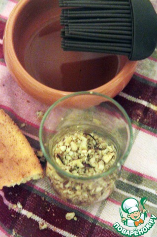 Начинаем собирать наш десерт. Вниз выкладываем бисквит и поливаем пропиткой, сверху смесь из орехов и каштана и снова пропитка.