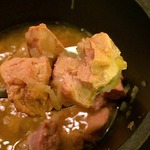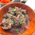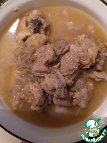 Чугунок закрыть крышкой и поставить на огонь. Когда мясо начнёт закипать, снимите пену и сделайте маленький огонёк. Как видно на фотографии, мясо само по себе даёт достаточно воды. Мясо должно тушиться под закрытой крышкой.