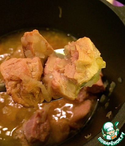 Мясо помыть, хорошо вымочить, нарезать на куски размером 2,5-3 см. Уложить в чугунок или в другую толстостенную посуду, можно делать и в сковороде, главное, чтобы для неё была крышка.