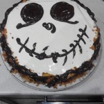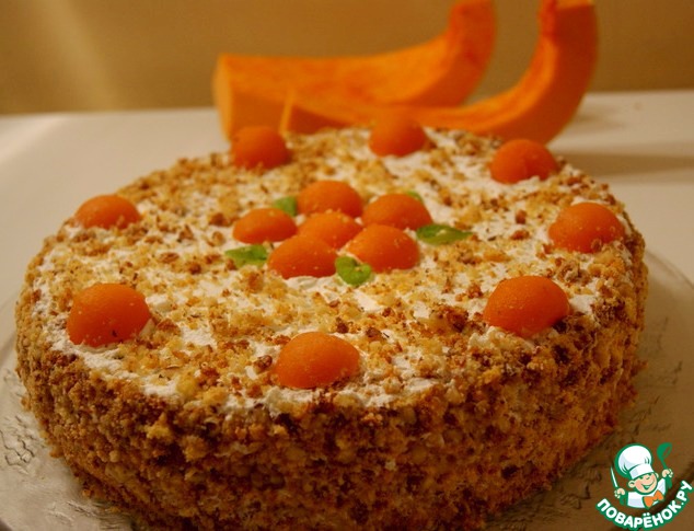 Накрыть вторым пропитанным коржом, нанести на бока и верх сливочный крем, украсить орехами 100 г и бисквитной крошкой. Сверху поместить тыквенные шарики и листочки мяты.