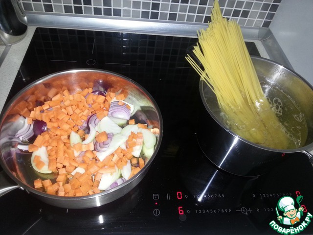 Разогреваем большой сотейник, обжариваем на оливковом масле лук и морковь.