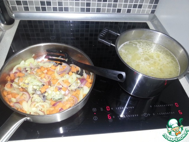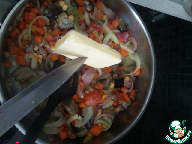 - Овощи (замороженная "Португальская смесь" или свежие овощи: баклажан, томат, сельдерей, кукуруза, маслины) — 1 упак.