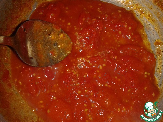 • Доводим до кипения под крышкой, снимаем крышку и тушим помидоры минут 8, до густого соуса. Солим поваренной солью, перчим и снимаем с огня.