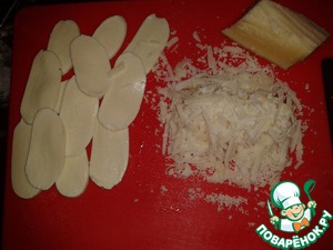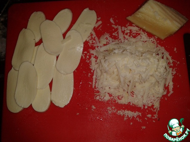 • Пока пицца печется, режем моцареллу и трем пармезан на крупной терке.