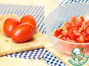 • Первым делом нам нужно приготовить заправку, чтобы она промариновалась. Для мы возьмем помидоры (в книге снова сливовидные... а у меня на этот рас сливовиднык черри)). И так, помидоры моем, режем пополам, удаляем семена и достаточно мелко рубим. Перекладываем в салатник.