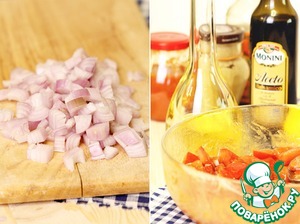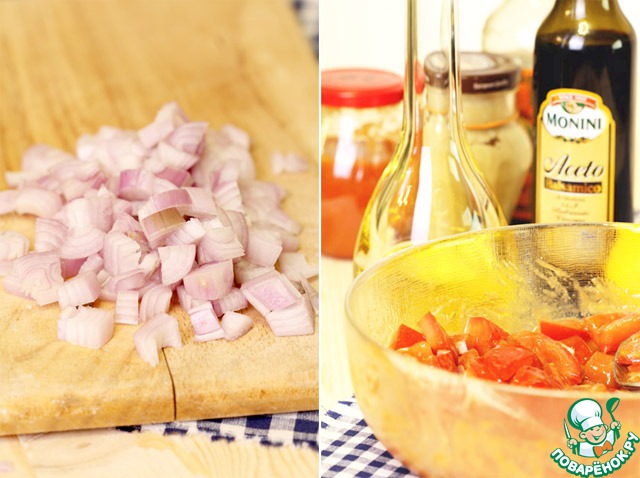 • Так же мелко порежем лук (я брала шалот). Добавим к помидорам лук и все необходимое, а именно: кетчуп (рецепт можно посмотреть тут http://www.povarenok .ru/recipes/show/790 79/), вустерский соус, дижонскую горчицу, несколько соус табаско, сок 1 лимона, бальзамический уксус, 2 ст. л. оливкового масла, эстрагон и петрушку. Тут мне пришлось немного отступить... обошлась без петрушки. Все хорошо перемешиваем, накрываем пленкой и отправляем в холодильник до подачи. На всякий случай — минимум 20 минут!