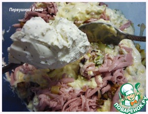 • Сметанную смесь кладем к начинке. Добавляем творожный сыр,