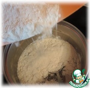 Снимаем с огня. Просеиваем муку и добавляем 3/4 стакана муки в получившуюся смесь.