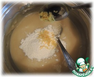 Соду смешиваем с 1 столовой ложкой муки и всыпаем в тесто. Добавляем цедру и оставшуюся муку.
